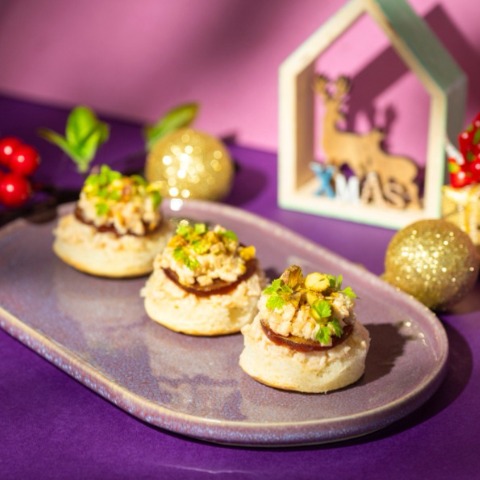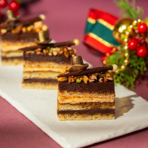 甜點包括聯名限定的 「繽紛巧克力布丁杯」、層次豐富的 「咖啡巧克力歐貝拉」 與香氣馥郁的 「覆盆莓巧克力萊明頓」;鹹點則有點綴金箔的 「鵝肝雞肉慕斯佐開心果布里歐」 與細緻優雅的 「爐烤鮭魚白花菜慕斯檸檬凍」,每一道都蘊藏驚喜與創意。下午茶另附香草與巧克力司康,為美味饗宴增添完美句點。