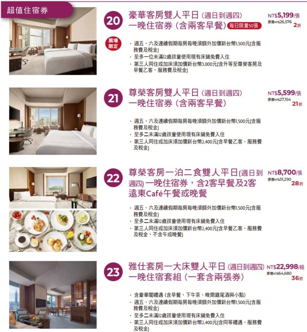 - 本券於11/21-22(含)、12/19-23(含)、聖誕節及跨年期間12/24-1/1(含)、過年期間2/13-2/21(含) 、6/12-18(含)等同現金,須補當日房價之差額方得使用。