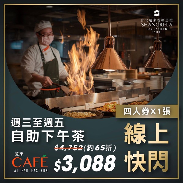 - 週三至週五自助下午茶四人券x1張:每張NT$3,088 (原價NT$4,752,約65折)