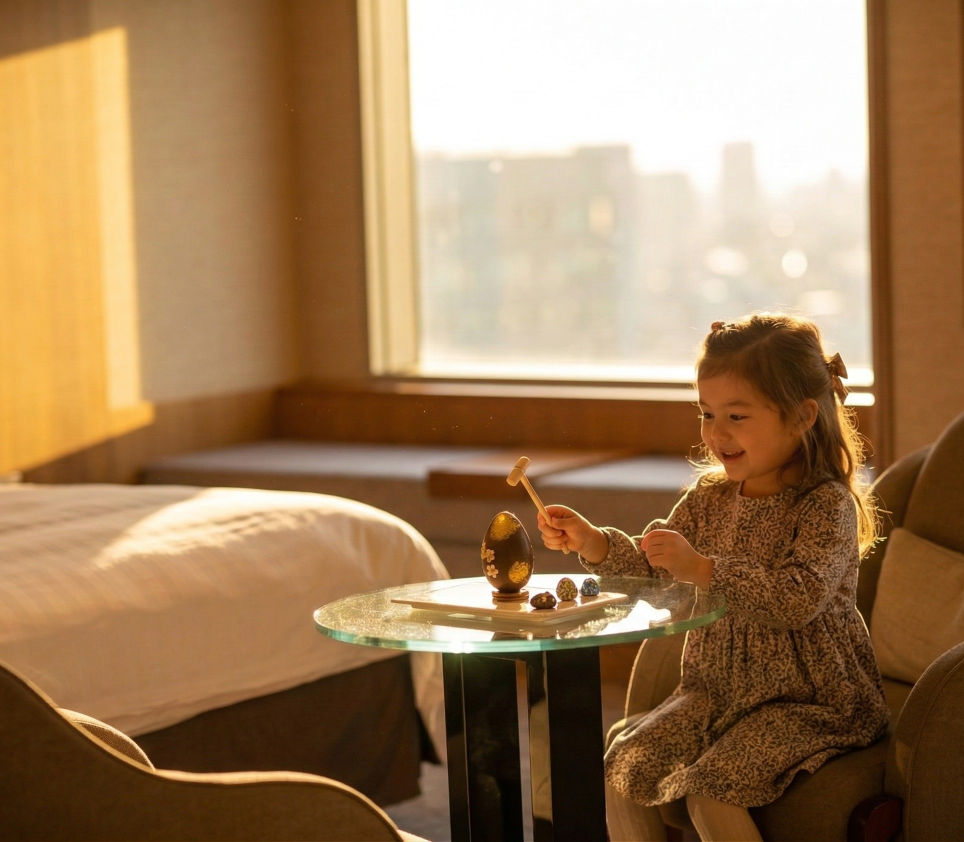 4 月 1 日至 7 日,台北遠東香格里拉將節慶驚喜延展至雲端居所。入住豪華客房或以上房型,迎接孩子燦爛笑容的,是房內專屬的迎賓禮「敲敲巧克力」——讓小手親自敲開精緻外殼,挖掘藏在其中的甜蜜彩蛋。在慵懶俯瞰大台北全景的質感空間裡,您可以隨時點選五星級客房餐飲;或是前往全台最高頂樓泳池,在暖陽下遠眺台北 101,與家人編織最難忘的春日回憶。